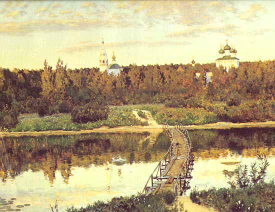 В послеполуденном свете в тишине лесов и в безлюдье замерла река. В прозрачной реке, как в зеркале, отражаются пушистые облака, голубые купола церквей и лес, темный, безмолвный лес. Через реку перекинут шаткий мостик, по которому дорога ведет к белокаменной церкви, окутанной густыми, зелеными зарослями. Старый, ветхий мостик, у которого нет одной дощечки, многие годы служил людям, как дорога к храму. Человек, идущий по мостику, видел в воде отражение золотых куполов и дивился такой красоте. Художник на этой картине хотел показать волшебную силу красоты природы, которая исцеляет душу человека.